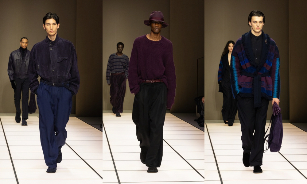 Il punto di vista creativo nasce dal debutto di Leo Dell’Orco, dopo quarant’anni di esperienza all’interno della maison accanto a Giorgio Armani. Il risultato è un dialogo naturale tra continuità e segno personale: lo stile Armani si illumina di nuovi riflessi, mantenendo quella sottigliezza e quella disinvoltura che ne costituiscono l’essenza. L’idea di cangiante diventa così metafora di uno stile che cambia senza mai tradirsi.