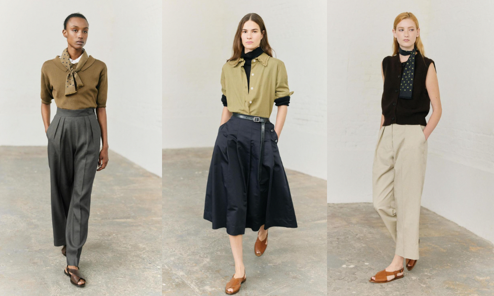Lo spazio della presentazione era privo di artifici, un luogo dove il silenzio amplificava la presenza dei capi. La luce filtrava dalle ampie finestre e si rifletteva sulle texture naturali: popeline di cotone, lino lavato, lana leggera. Ogni pezzo era esposto come un oggetto da osservare con lentezza, pantaloni morbidi, camicie destrutturate, giacche dal taglio lineare, trench fluidi. La palette, dominata da beige, grigio fumo, blu notte e verde oliva, disegnava una mappa cromatica pacata, quasi meditativa. Margaret Howell non insegue la tendenza: la crea, nel momento in cui riafferma il diritto alla misura, alla durata, alla bellezza che non ha bisogno di essere gridata.