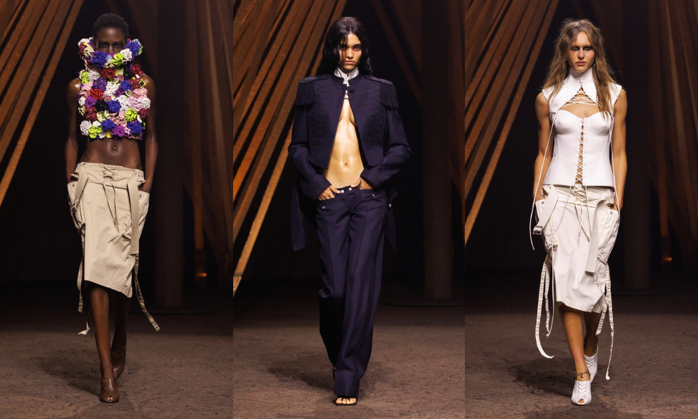 McGirr costruisce la collezione come un campo magnetico dove opposti si attraggono e si respingono. L’ispirazione arriva da The Wicker Man (1973), film cult britannico che indaga il confine fra fede e follia, desiderio e sacrificio. Il risultato è una visione sartoriale che esplora la disintegrazione dell’uniforme e la nascita di un nuovo corpo sociale, libero e vulnerabile. Le giacche, simbolo di autorità, vengono smontate e ricomposte, tagliate da tasche disallineate, scollate, destrutturate. Le stoffe militari si mescolano a bustier taglienti, mentre gonne e pantaloni scivolano sul corpo con una libertà che rompe ogni rigore. L’uniforme, da simbolo di potere, diventa atto di ribellione.