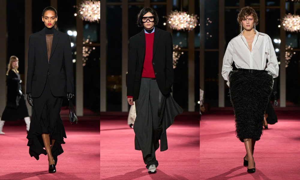 La collezione gioca su materiali preziosi: lana, cashmere, pelle e tessuti luminosi si alternano con naturalezza. Le tonalità spaziano dai neutri caldi, cammello, beige, nero, a sfumature più profonde e sensuali. I dettagli metallici e le superfici glossy aggiungono un tocco di modernità, mantenendo però l’eleganza come filo conduttore.
