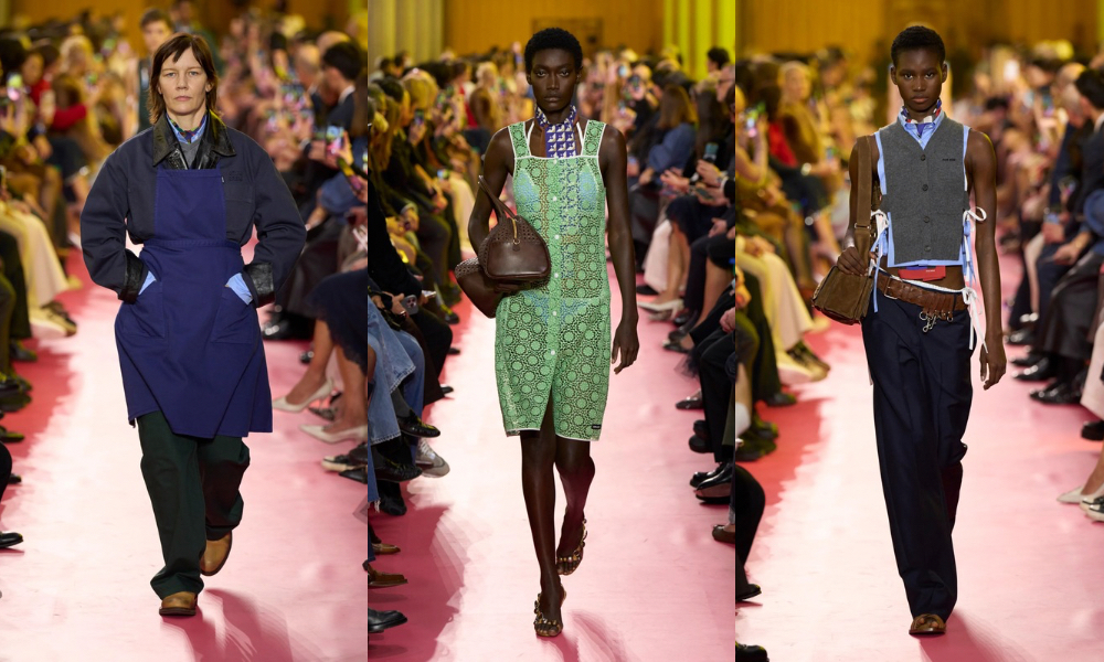 Nel finale, la collezione esplode in un gioco di contrasti: abiti in pizzo bianco, taffetà scuro, pelle lucida e trasparenze estive convivono con le linee severe dei grembiuli operai. È il dialogo tra due mondi, lusso e lavoro, eleganza e sopravvivenza, che qui si incontrano senza giudizio. Miu Miu riesce a trasformare l’umiltà in stile, l’usura in fascino, l’abitudine in arte. È una moda che parla al presente, che riconosce la complessità del quotidiano e la rende desiderabile. Nessuna idealizzazione, nessuna fuga: solo la bellezza del reale. In un momento storico in cui la moda rischia di perdere contatto con la vita, Miuccia Prada ricorda che la rivoluzione può iniziare da un grembiule.