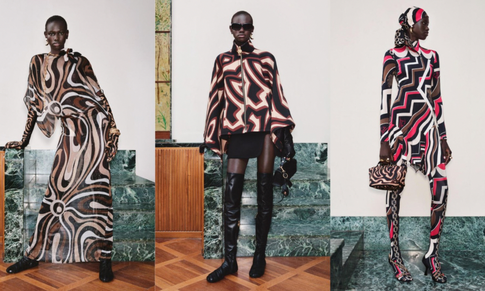 La collezione non si ferma all’abbigliamento, ma si completa con accessori che esaltano l’anima audace della maison. Le borse Marmo e le baguette giocano con contrasti di superfici opache e lucide, mentre stivali alti oltre il ginocchio, impreziositi da catene e dettagli gioiello, diventano simboli di carattere. Le piccole bag da sera si reinventano in nylon Labirinto o in tonalità accese come il rosso, fino a trasformarsi in veri e propri bracciali da portare al polso. I foulard, iconici e immancabili, continuano ad attraversare le epoche come segno distintivo di eleganza, affiancati da gioielli scultorei e fiori in pelle realizzati a mano. Non manca nemmeno una selezione lifestyle che porta Pucci fuori dalla passerella: portagioie in seta, ombrelli da indossare come accessori e cuscini da viaggio che trasformano ogni momento in un rituale di stile.