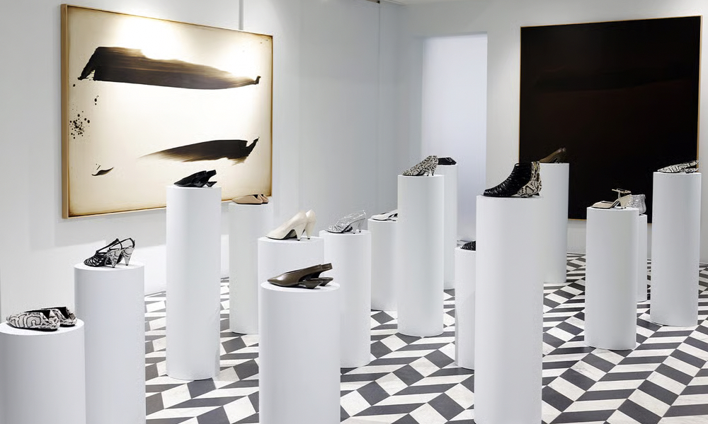“The Art of Form” mette in campo riferimenti visivi forti: tele astratte, segni pittorici ampi e pennellate audaci che si intrecciano con le sagome dei modelli. Il concept è stato esplicitato dallo stesso brand nei materiali promozionali: le linee scultoree delle creazioni calzaturiere emergono grazie al contrasto con forme pittoriche bold che amplificano la tridimensionalità del design. Le scarpe diventano tele da modellare, superfici in grado di riflettere luce e ombra, accentuando curvature e tagli con forza visiva.