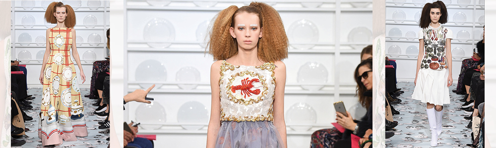 Il pezzo forte della Collezione sono senza dubbio le stampe, caratterizzate da una simpatica alternanza di servizi da tavola e pasti: i piatti, le teiere e le tazze di porcellana corredati da cucchiai, forchette, e adornati con fiori per una completa mise en place sulle voile e i tulle, dove vengono serviti secondi prelibati a base di aragoste al limone, contorni di verdure in ratatouille, dessert golosi e applicazioni di dettagli fruttati, come le spille a forma di mirtillo e ciliegia. Il tutto è riportato sia su blouson e su gonne al ginocchio per il giorno, che sugli elegantissimi abiti a strascico per la sera.