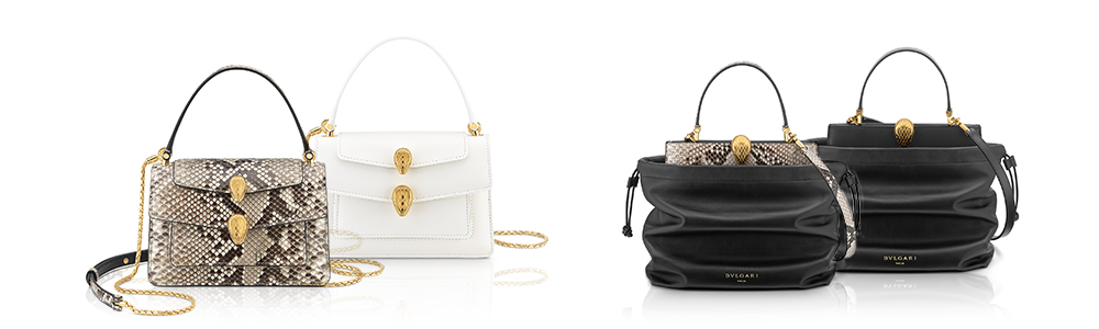 Il pezzo di punta della collezione è la Serpenti Forever Bag, reinterpretata in sei versioni diverse in una gamma di differenti colori: nero, bianco, tonalità pastello e stampe animalier. Alexander Wang ha inserito sul risvolto di chiusura alcune tasche, ciascuna con una sfavillante testa di serpente, e in questo modo ha trasferito la sua estetica street ed essenziale alla forma originaria della borsa. Quindi coniuga un mix eclettico di forme innovative a silhouette più tradizionali e rimane, come tutti gli accessori della maison Bvlgari, senza tempo.