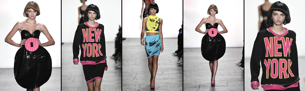 Si parte con lo stile sado-futurista dello stilista americano Jeremy Scott, dove l’occhio rimane folgorato dai colori fluo accostati a gonne in vinile, anche la pelle è presente, abbinata a top micro o a camicie dal taglio over. Gli abiti sono coloratissimi, con tagli futuristici e nostalgiche maxi stampe.