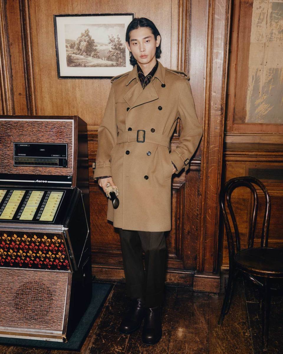 La palette cromatica celebra l’eleganza britannica: beige conchiglia, ghiaccio, cammello, navy e nero, con accenti di argilla, mogano e blu crepuscolo. Toni neutri e terrosi si combinano con nuance profonde, costruendo una grammatica cromatica che parla di comfort, autenticità e modernità. Le proporzioni cambiano: trench più morbidi, volumi dinamici e tessuti che seguono naturalmente le linee del corpo.