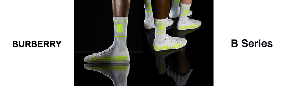 Calzini con motivo monogramma a intarsio fluo e sneakers in gabardine di cotone con logo stampato nella nuova B Series di Burberry. Tutto d’ispirazione tennis. Lo sport non è mai stato così cool.