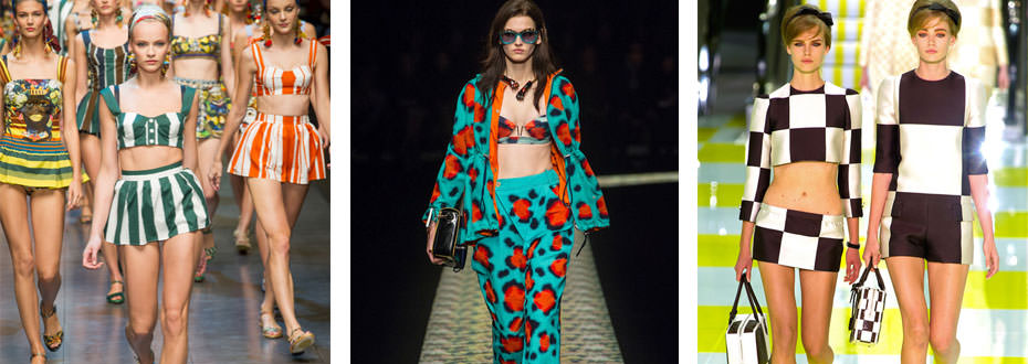 Il Cropped Top 2013 diventa un po’ più sobrio, si diceva. Le passerelle sono letteralmente invase dalle pance scoperte e gli stilisti lo propongono in versione very chic: Dolce&Gabbana e Antonio Marras realizzano un look di ispirazione anni 50, con fantasie e colori, gonne corte e ampie, a vita alta, e toppini appena sotto il seno. Louis Vuitton punta agli anni 60 sia nei volumi sia nelle stampe, con micro gonne a vita bassa e cropped top a manica lunga. Balmain e Kenzo portano in passerella pantaloni a vita altissima e top super small, in modo da lasciare a vista un piccolo pezzo di addome, proprio all’altezza dello stomaco, mentre Balanciaga punta su gonne a portafoglio a vita alta e top oversize.