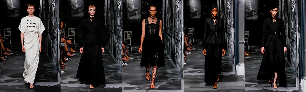 Come ogni fashion show vuole, il direttore artistico del brand deve essere in grado di conferire un messaggio che arrivi con l’aiuto di metafore e suggerimenti al cuore del suo pubblico. Di norma il look che apre la passerella della stilista è sempre “parlante”, e questa volta non è stato da meno. Ad aprire la sfilata parigina, sulle note di Vivaldi, è stata una blusa che riportava la scritta “are clothes modern?”, citazione che inevitabilmente invita ad una riflessione sul ruolo della moda oggigiorno.