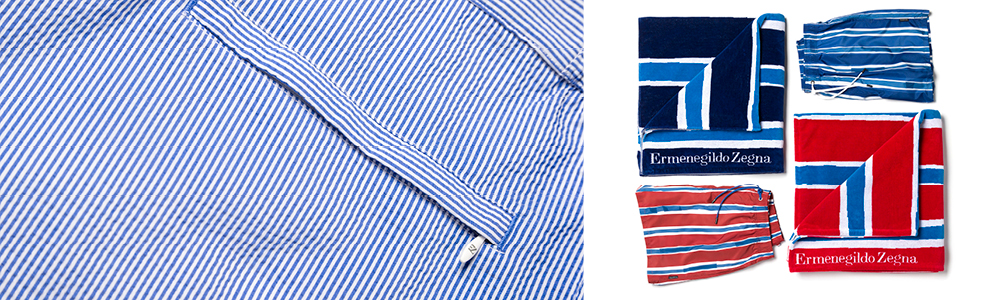 La linea Zegna Beachwear possiede un’allure italiana fresca ed estiva, ed è composta da boxer da bagno con pochette impermeabile coordinata, polo, teli mare, maglie con scollo a barca. I modelli sono sportivi e variano dalle tinte unite con orlo a contrasto a stampe e fantasie; tra le stampe, troviamo righe Baiadera disegnate a mano, fiori stilizzati e micro fantasie geometriche. I materiali utilizzati sono leggeri e tecnici, per garantire le migliori performance sia dentro che fuori dall’acqua.