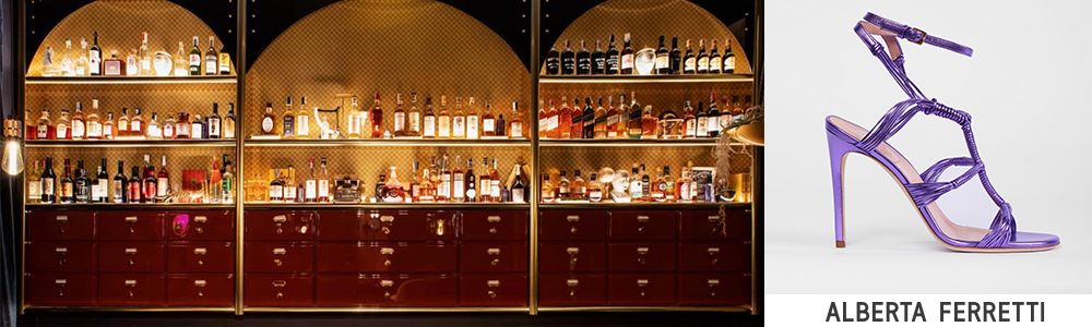 Nel resto della collezione, invece, il luccichio dei cristalli richiama la lucentezza del bancone in legno e la moltitudine di lampadine sul soffitto. Concludendo la citazione di queste novità footwear 2020, il verde marmorizzato delle pietre incastonate su basi dorate riecheggiano le poltrone in suede addossate alle pareti.