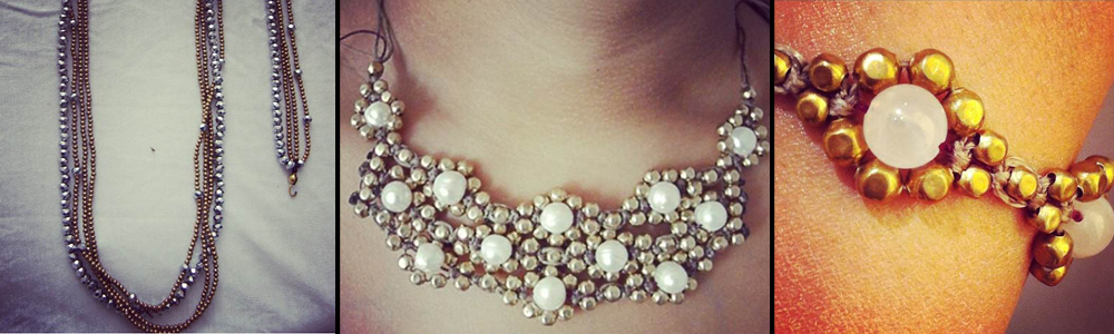 Braccialetti, colane, anelli e perché no, cavigliere rigorosamente fatte a mano con sfere bronzee e pietre dure dagli svariati colori, con una attenzione particolare all’effetto d’insieme, già creato e perfetto in natura, come una pietra trovata sulla spiaggia e semplicemente lucidata per far risaltare la sua bellezza già unica.
