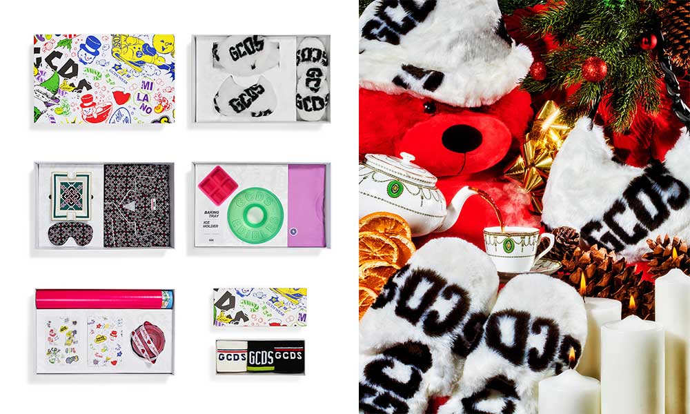 Per i più ironici GCDS crea invece la box EDIBLES con una t-shirt stampata, un vassoio per cubetti di ghiaccio e uno stampo per torte. Poi, LOGO LOUNGER, per i più classici, include un pigiama, un posacenere e una mascherina da notte con un motivo anni Sessanta. Si prosegue con la box WRAP IT UP, per i più creativi, con articoli personalizzati per incartare regali. Infine, il kit HAPPY SOCK-MAS include le classiche calze a coste con logo.