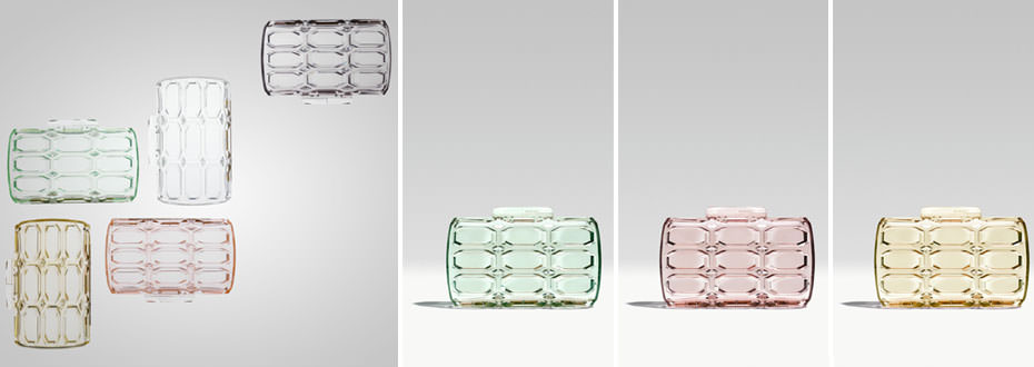 Essa richiama infatti i motivi e le cromie delle gemme ed è realizzata con una tecnica speciale di incisione del plexiglass, utilizzata anche nella produzione dei gioielli.