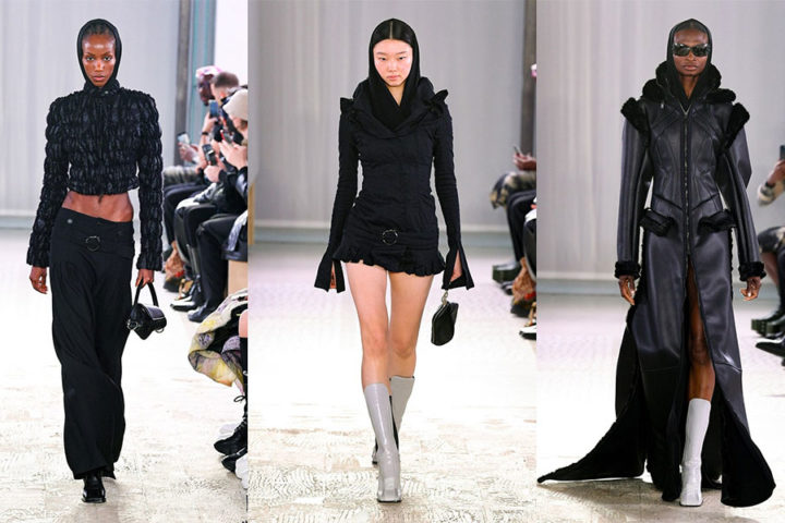 Gli abiti, fluidi e scorrevoli sul corpo femminile, non sono altro che un immediato richiamo al comfort e alla delicatezza degli abiti da notte. I capispalla sono vari: ognuno è adatto a qualsiasi fase del giorno. All’interno della collezione, si passa dalla giacca corta puffer al cappotto doppiopetto dal taglio trench. Trussardi si concentra da sempre sulle forme, e l’alternanza di stili, materiali e tagli dimostra la grande attenzione per il particolare e per l’universo femminile che viene simboleggiato. Gli accessori che accompagnano gli outfit, nonché DNA di Trussardi, sono mini borse e box bags in stampa rettile e secchielli in pelle. Le scarpe invece, passano da un estremo in stile cavallerizza ad un sandalo invernale elegante.