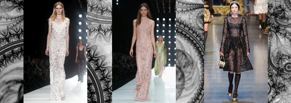 Romantico o gotico a seconda del colore, retrò o moderno a seconda dei modelli, ma soprattutto onnipresente nelle collezioni 2013. Il gioco sensuale del vedo-non vedo si declina in tutto ciò che una donna può desiderare ed indossare. Sulle passerelle degli stilisti italiani l’esaltazione del pizzo non può passare inosservata: dalle tinte pastello che sembrano evocare una donna angelica, soave e castigata di Roberto Cavalli, al suo esatto contraltare che è da rintracciare negli abiti neri, immediatamente sexy, appariscenti e dal gusto retrò di Dolce & Gabbana. Anche Valentino non nasconde la sua passione per il fascino seducente e malizioso del pizzo nero, proponendo decolletè spuntate, in pelle color nudo, totalmente ricoperte di pizzo nero ed ingentilite da un fiocco frontale, anch’esso rigorosamente in pizzo.