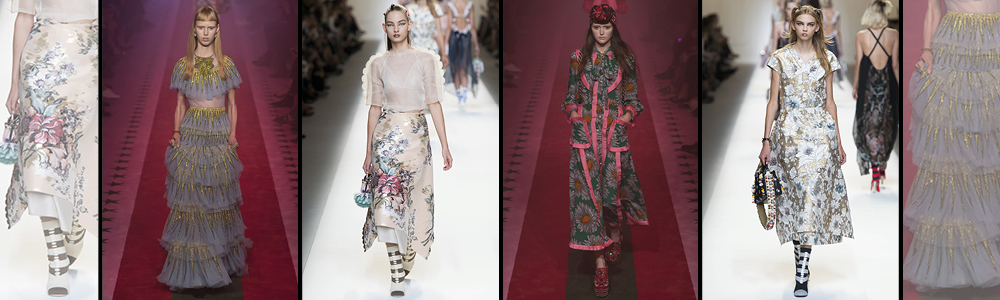 Il Made in Italy sembra farla da padrone anche nei decori in stile rococò del ready-to-wear di Fendi, con tessuti dorati, organza e ricami floreali, mentre nelle stampe grafiche di Miuccia Prada ritroviamo la sua costante passione per l’Art Decò.