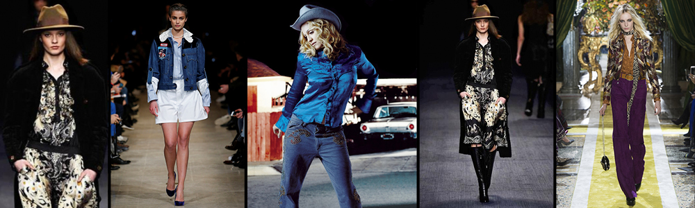 Mentre il brand Miu Miu ha esplorato il mondo del denim equipaggiato della reinterpretazione degli stivali di Uma Thurman­­, Saint Lauren ha espresso al meglio il suo lato country attraverso l’utilizzo delle frange più sofisticate; A cavalcare l’onda dello stile Country per questa fredda stagione accorrono anche Roberto Cavalli, Trussardi, Fay, Gucci e Burberry Prorsum. Insomma, l’anima dell’antico West rimane invariata, ma viene tradotta in chiave raffinata e chic per le occasioni più glamour.