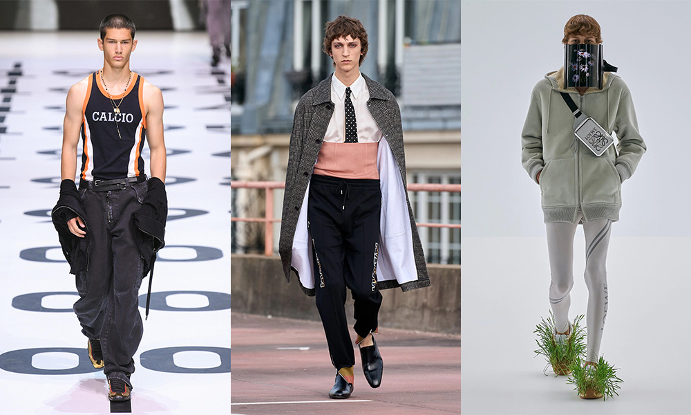 L’item immancabile che ha accomunato svariate passerelle sia maschili che femminili è il classico pantalone della tuta con coulisse, indossato al di fuori del contesto sportivo e non solo nel tragitto casa-palestra. A proporne la loro visione sono stati Dolce & Gabbana a Milano con la loro nuova edizione di ciò che proveniva dall’archivio del brand, che urla forte l’amore italiano per il CALCIO. Da Parigi Dries Van Noten mostra il suo tocco dandy abbinandoli a camicia e cravatta, e Loewe con Jonathan Anderson fonde natura e tecnologia proponendo look composti da overshirt, felpe con cappuccio e leggings. Per i più audaci!