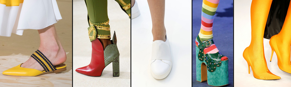Le calzature per questa Primavera/Estate 2017 sono variopinte ed eclettiche, i colori sono sgargianti e variano dal fucsia acceso ai toni del verde, in un arcobaleno di tendenze e stili che riportano anche ricordi dal passato; fuori dagli schemi, visionarie e futuristiche, a volte hanno bisogno di supporti che vanno ben oltre le parole per descriverle.