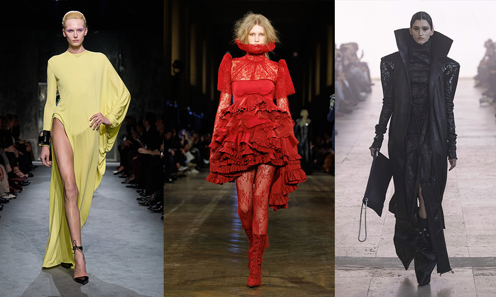 Il nero domina incontrastato come in un capolavoro di Hitchcock: trench lunghi e silhouette affilate richiamano Vertigo e Rebecca, ma con un twist contemporaneo fatto di pelle lucida, vinile e dettagli cut-out. Prada e Alexander McQueen hanno costruito collezioni che sembrano dialogare con la tensione visiva del cinema d’autore. Al contrario, i tocchi metallici e le texture tech parlano la lingua del futuro: Balenciaga, Rick Owens e Mugler sembrano aver guardato Blade Runner e Dune per immaginare un guardaroba distopico ma irresistibilmente cool.