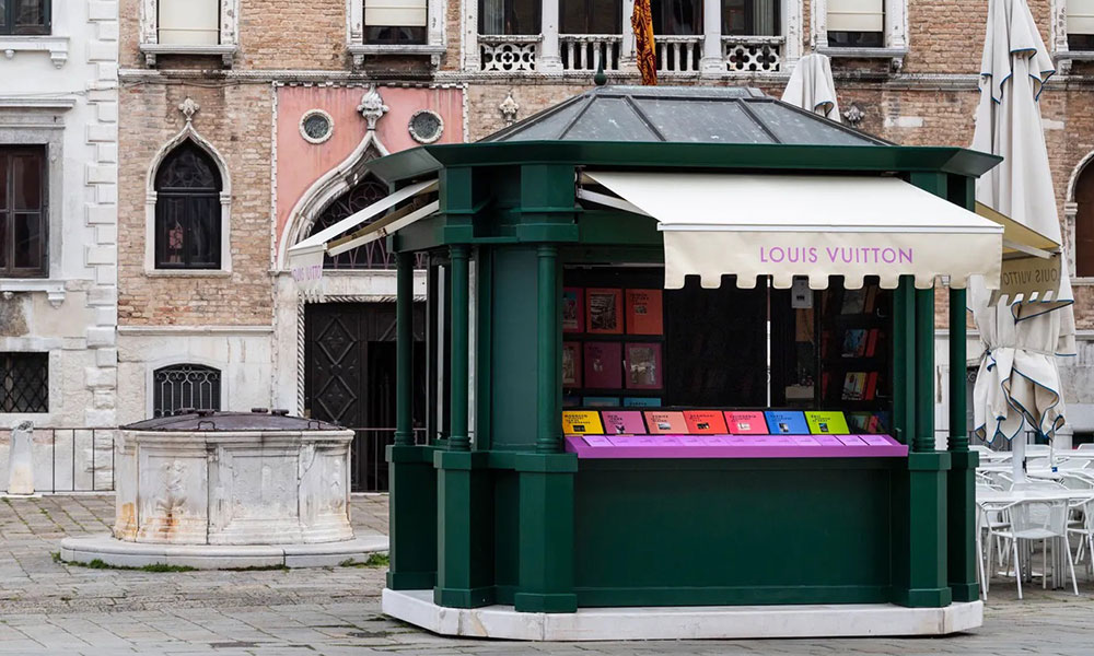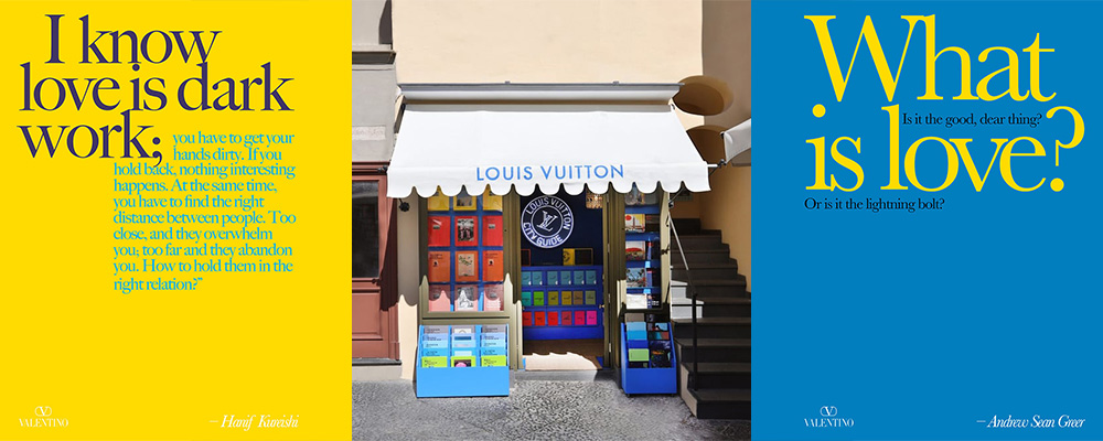 Molto legata alla letteratura dai tempi degli eredi dei suoi fondatori è la maison Louis Vuitton. Con le sue serie denominate Louis Vuitton Travel Books, Fashion Eyes, City Guides, la Maison nata da un legame indissolubile con il viaggio, è approdata a Capri e Venezia ristrutturando le sue storiche edicole in occasione della Biennale. Il progetto dal nome La librairie éphémère ha ridato luce a quelle edicole sparse nelle città, fulcro di storie e chiacchiere tra vicini di quartiere, dandogli i colori della palette cromatica che caratterizza le raccolte Louis Vuitton.