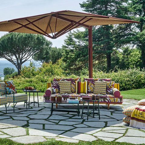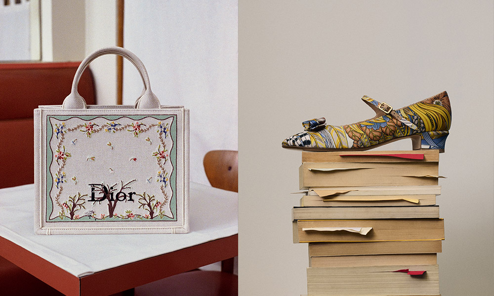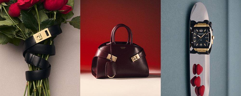 Ferragamo sceglie invece il gesto dell’abbraccio come metafora. La Hug Bag, in pelle borgogna o nera con interno rosso, diventa rifugio e dichiarazione insieme. Accanto, la mary-jane con fiocco Vara e stampa floreale multicolor rilegge la femminilità con equilibrio tra heritage e modernità. Due foulard in seta – uno dedicato a Palazzo Spini Feroni, l’altro con composizione floreale su fondo optical – completano la proposta con un tocco grafico e raffinato.