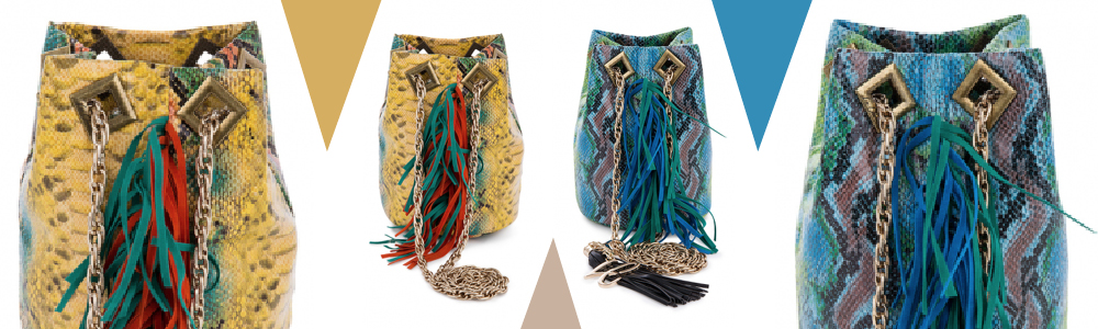 Le borse sono originali, realizzate con materiali innovativi e di qualità elevata, una diversa dall’altra, adatte per il giorno e per la sera, per soddisfare qualunque esigenza. Dopo un cupo inverno dominano colori fluo, blu elettrico, rosa shocking, ma anche giallo limone e verde smeraldo che, insieme a tinte neutre, vengono combinati tra loro per creare pezzi unici che spiccano in mezzo alla folla; a completare i modelli, frange e borchie. In questa collezione sono presenti zaini etnici e rock.