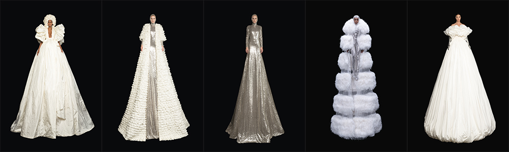 Gli abiti si snodano in silhouettes esagerate, slanciandosi verso l’alto, in un’illusione di infinita altezza. Pier Paolo Piccioli presenta per Valentino una collezione in total white, dove il movimento è unico protagonista. Questo è reso ancora più spettacolare dalle ruches, le frange e le piume presenti sugli abiti. Gli abiti, presentati su sfondo nero, sembrano fluttuare in una dimensione onirica, dove i giochi di luce sui tessuti sequin li fanno sembrare ancora più eterei. Vere e proprie sculture, non abiti, in cui nonostante i volumi esagerati la leggerezza è evidente: qualcosa a cui Piccioli ci ha abituati e alla quale non sembra voler rinunciare.