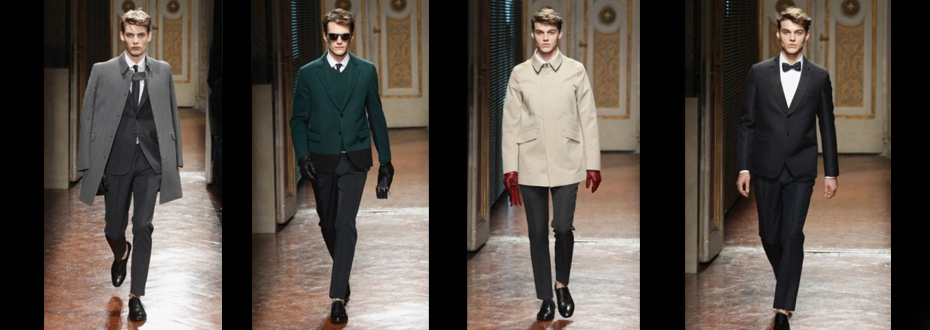 I pantaloni asciutti e corti alla caviglia, accompagnati da camicie bianche con cravattini sottili e papillon da vero gentleman. I colori maschili: blu scuro, grigi, verde bottiglia e beige. A spezzare questa classicità un tocco di design attuale è dato da borselli con porta i-Pad e gli occhiali in metallo smaltato. A mostrare la collezione 25 modelli per 35 outfit visibili dal vivo e da megaschermi che alternano immagini del cinema in bianco e nero.