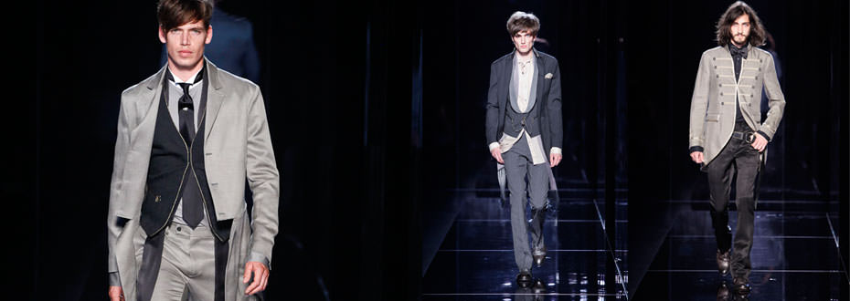 Le scarpe in pelle spazzolata, le sacche di lino spalmato e pelle, gli occhiali da aviatore, le cravatte e i papillon in maglia metallica fanno percepire l’anima rock della collezione palesemente ispirata a Bryan Ferry, David Bowie e Jim Hendrix.