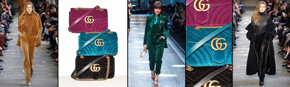 Trionfo di velluto anche per gli accessori di Gucci, che ha visto la reinterpretazione da parte di Alessandro Michele di pezzi iconici in chiave assolutamente originale: il classico mocassino Jordaan abbandona la pelle per ricoprirsi di velluto rosa o blu, la slipper Princetown, tendenza più fotografata delle ultime stagioni, affianca al pelo velluti sgargianti e iper decorati, ed infine la borsa GG Marmont, che si fa chic in diverse varianti di velluto: nero, fuxia, blu o celeste.