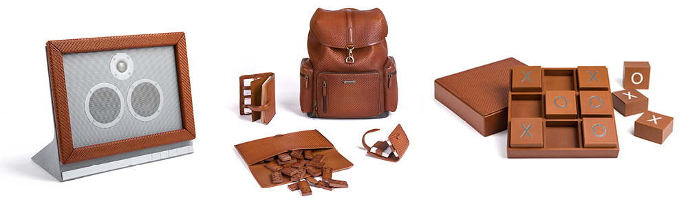 Gli articoli sono pensati per tre diversi momenti della giornata: “Essential”, una collezione di piccola pelletteria per la vita professionale dell’uomo composta, ad esempio, da uno svuota tasche, un porta biglietti da visita e da un porta occhiali. “Toyz”, composta da oggetti utili per il tempo libero e l’intrattenimento, giochi da viaggio come il domino o il porta carte da gioco. Infine “Technological”, accessori multimediali come cuffie, auricolari, o l’elegantissimo giradischi, tutti realizzati in collaborazione con Master & Dynamic.