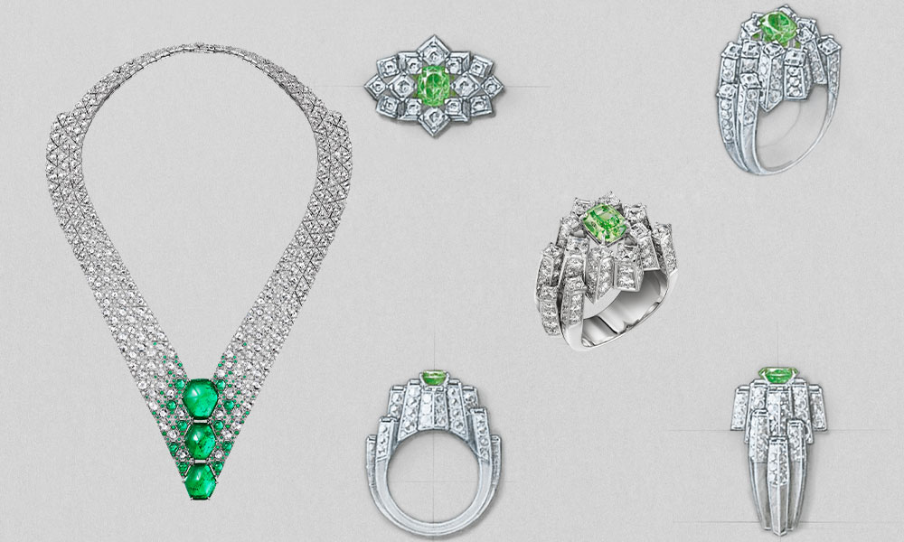 L’ecosistema sottomarino è rappresentato dal collier Récif. Il corallo ne è elemento portante, a contrasto con gli smeraldi, che si snodano lungo un atollo di diamanti. Infine, Rituel omaggia le tradizionali parure mesoamericane, presentando una doppia fila di sferette di calcedonio azzurro alternate a una costellazione di rubini.