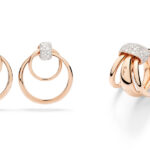Al centro della linea, il bracciale Vimini avvolge il polso con un’onda dorata composta da elementi romboidali uniti da maglie flessibili invisibili. La collana segue il décolleté con movimento fluido, mentre l’anello a cinque fasce addolcisce la geometria originale in una forma contemporanea. Gli orecchini, disponibili anche in versione ear-cuff, esprimono la verticalità e l’audacia del design modulare, mantenendo una forte eleganza italiana.
