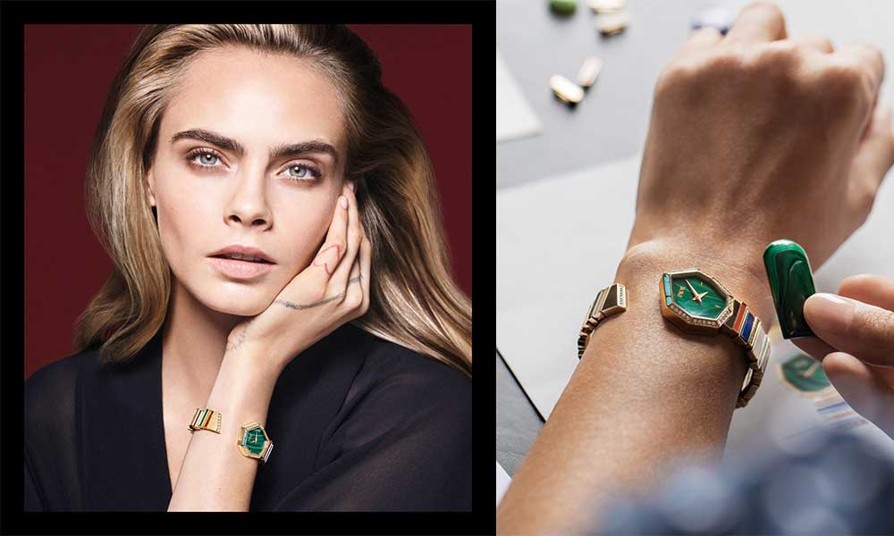 La geometria atipica del design di questa collezione si estende a una gamma irresistibile di gioielli: un anello e un braccialetto in oro giallo con maglie deliberatamente disallineate in pietre preziose e diamanti per creare un’impressione ondulata di blu e verde; con uno stile più monocromatico vi sono anelli, bracciali e orecchini in oro giallo, rosa e bianco, interamente o semi pavimentati con diamanti. Il gioco del contrasto sulla raffinata lavorazione del metallo fa risaltare il design distintivo che caratterizza le creazioni.