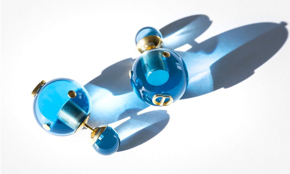 Gli iconici orecchini Dior Tribales sono stati reinventati per la nuova stagione con esclusive versioni di colore, prediligendo tonalità trasparenti di blu, arancione, giallo e rosa.