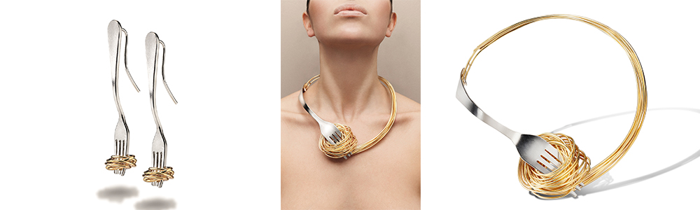 La collezione INCUBeat trasforma oggetti di uso quotidiano come delle forchette, in pezzi unici di alta gioielleria realizzati interamente a mano. Gli orecchini e il collier sono formati da una banda in argento che ricrea la forma di una forchetta che avvolge nei suoi rebbi dei soffici nidi di spaghetti bagnati in oro. Un richiamo ai gesti quotidiani e alle materie prime, genuine, simbolo del Made in Italy in tutto il mondo, che enfatizzano l’assoluta necessità di sostentamento universale.
