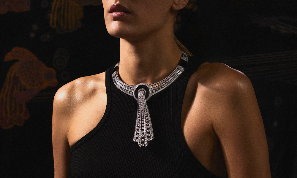 La cravatta, capo maschile per eccellenza, viene ripensata in forma di gioiello in Cravate Émeraude, una collana in oro bianco chiusa da una spilla removibile realizzata con uno smeraldo zambiano da 8,02 carati su un pavé di diamanti. Indossabile come cravatta o collana, lo smeraldo stesso diventa removibile e opponibile su un altro gioiello. Lo stesso pensiero si nasconde dietro a Lavallière Diamants, altro pezzo che ricorda la cravatta, indossabile come collana, collarino o fermacravatta, oppure si può scomporre a ottenere degli anelli. La designer non si limita a rievocare l’Art Déco, ne celebra anche il contesto parigino. Con l’impiego di 28 smeraldi, per un totale di 24,59 carati, il Col Emeraudes rievoca la maestosità di Place Vendôme, grazie al design che ne richiama la forma e il motivo a ciottoli.