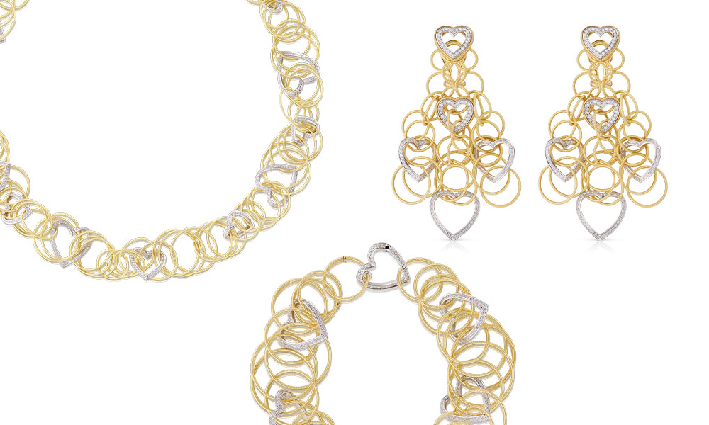 La collezione, composta da collana, orecchini pendenti e bracciale, è pensata per celebrare l’amore e il desiderio di stare insieme alle persone a noi care. Le creazioni sono un tripudio di oro e diamanti: piccoli cerchi in oro giallo si intrecciano tra loro creando una cascata leggera ma d’effetto in cui si riconoscono, inframezzati, dei cuori luminosi. Per questa occasione speciale Buccellati ha dato vita a una collezione in cui la seduzione incontra l’eleganza tipica della Maison.