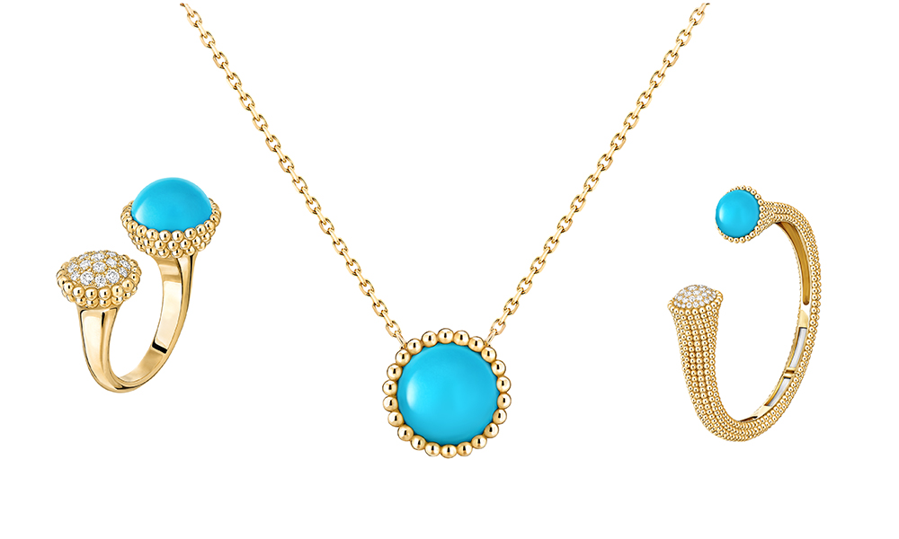 Le novità – una collana con pendente, un bracciale e un anello Between the Finger – vanno ad ampliare la linea Perlée couleurs, offrendo un’inedita armonia di materie. Reinterpretando l’estetica lanciata nel 2017, il bracciale e l’anello propongono un tête-à-tête tra una semisfera d’oro giallo incastonata di diamanti e un cabochon di turchese. Le estremità luminose dei gioielli sembrano sfidarsi in un gioco di equilibri e riflessi, mentre le perle d’oro che li compongono avvolgono con leggerezza il polso o le dita. Nella collana, invece, il cabochon di turchese è racchiuso da un profilo di perle d’oro che ne sottolinea l’andamento curvilineo.