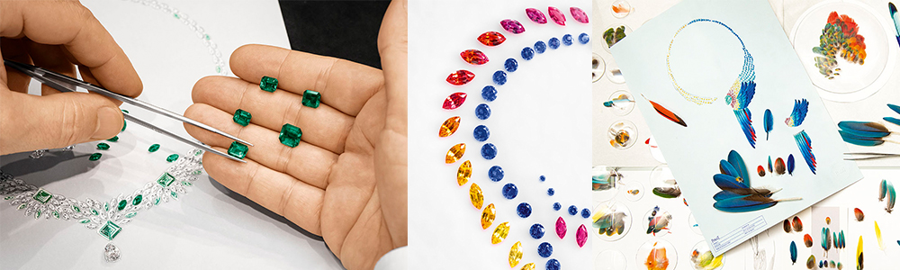 Oltre alle piume, sono stati utilizzati zaffiri di colori diversi. Al centro della collana troviamo la tormalina Paraiba da 7,49 carati del Mozambico. La collana può essere indossata con o senza l’elemento di piume, il quale può essere rimosso e indossato come un bracciale. Il colore risuona anche negli orecchini dello stesso set, che sono sapientemente articolati per portare comfort e movimento. Colori ipnotizzanti di zaffiri multicolore riecheggiano in tutta la collezione.