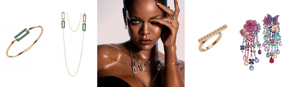 “Col suo stile unico ridefinisce il modo in cui le persone vedono e indossano i gioielli“, queste le parole di Caroline Scheufle riferite alla cantante vincitrice di numerosi Grammy e dallo stile inconfondibile e provocatorio. Unico come i gioielli ispirati ai colori accesi e vivaci dei giardini delle Barbados, terra natia della Star.