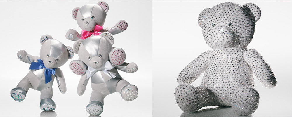 L’ispirazione vede il coinvolgimento di 232 cristalli che ricoprono il tessuto argentato con cui vengono realizzati i pupazzi, e la particolarità è che tutte le pietre sono ispirate ai colori di ciascun mese dell’anno. “I volti, le orecchie e i cuscinetti polpastrelli delle zampe degli orsi sono decorati con cristalli lucenti, mentre un fiocco di raso e decorazioni in pietra a forma di cuore assicurano che ogni pezzo sia tanto lussuoso quanto adorabile” spiega la stessa Maison, alludendo ad un prodotto d’élite curato in ogni singolo dettaglio.