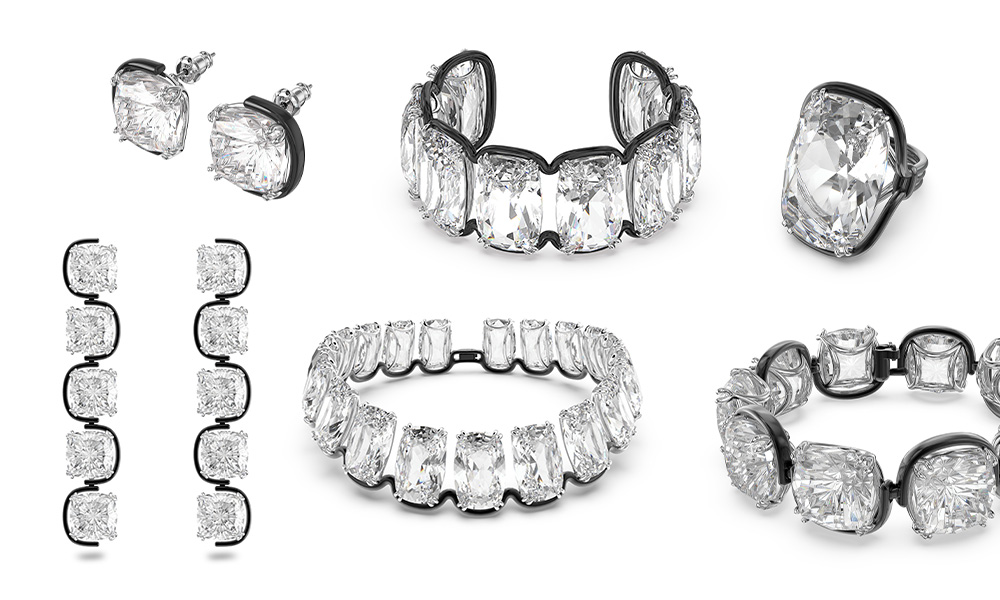 Tra questi troviamo Chroma, caratterizzata da pietre stratificate nella loro più pura espressione cromatica; Constella, una costellazione di cristalli incastonati su sottili barre di metallo e delicati come la polvere di stelle. Curiosa, caratterizzata da disegni intricati e complessi che stimolano l’immaginazione; Destra, detta anche mano di Crystal, che presenta un taglio preciso ed è unisex; Dulcis, che si ispira alla Modern Art; Fluenta presenta onde di cristalli Swarovski incastonati in nastri di metallo riciclato che scorrono dentro linee delicate; Gema, gemme incastonate tra di loro che formano un caleidoscopio; Armonia, cristalli oversize tagliati a cuscino che danno l’illusione di essere pietre galleggianti conferendo un senso di mistero; Iperbole, pezzi di cristalli ispirati a schemi matematici intricati tra loro in modo elegante; Lucent, caratterizzata da colori vivaci; Millenio, progettata per essere senza tempo; Orbita, che esplora la versatilità con elementi bifacciali e visibili da tutti i punti di vista; Ortyx, design a spillo ispirato al punk; Stella, radicata nell’eredità austriaca di Swarovski, trae ispirazione da uno dei gioielli più famosi dell’Austria, ovvero la stella dell’imperatrice Elisabetta d’Austria; infine Un, che simboleggia l’amore eterno e presenta l’iconico cigno Swarovski a forma di cuore.