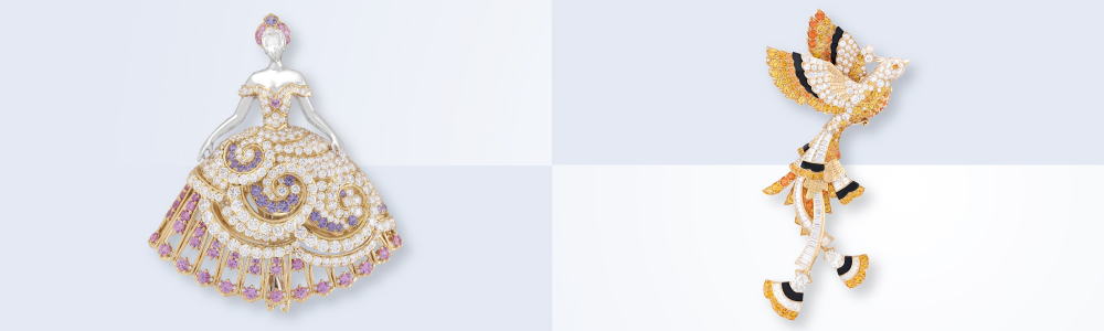 Ad impreziosire la Clip Oiseau d’or, che fa riferimento al racconto L’uccello d’oro e raffigura lo slancio elegante di un volatile nel cuore della notte, sono le piume di diamanti e gli zaffiri gialli. Questi ultimi sono presenti anche sulla meravigliosa Clip Princesse Danica, che raffigura una delle dodici principesse nella favola Le scarpe logorate dal ballo. Nella realizzazione delle principesse non poteva mancare la reinterpretazione delle silhouette di fate e ballerine, firme distintive della Maison fin dagli anni Quaranta.