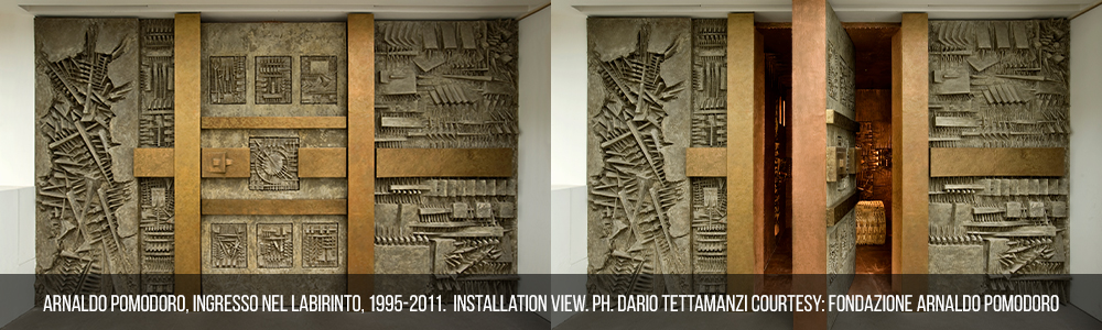 Un’opera ambientale che riflette e incorpora il percorso artistico di Arnaldo Pomodoro. Un percorso misterioso, fatto di stanze che portano ad altre stanze, di porte trabocchetto che girano su sé stesse e di misteriosi pertugi, con ruote, scudi e incisioni di strane scritture sulle pareti.