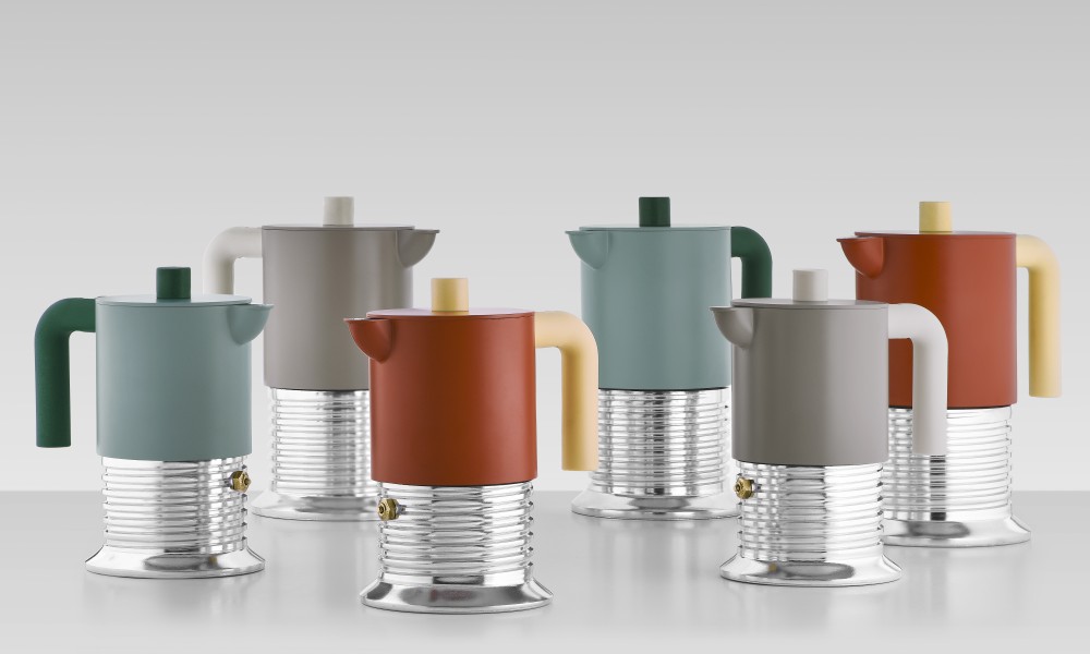 Se il corpo principale richiama l’estetica industriale, sono i dettagli a definire l’anima di Vite. Manico, pomolo e parte superiore si accendono di colore, frutto di una ricerca sviluppata direttamente nell’officina Alessi, in dialogo continuo con l’ambiente produttivo.