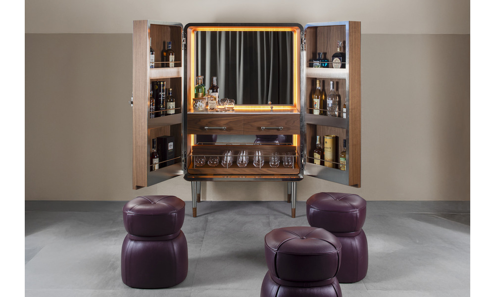A colpire è soprattutto l’equilibrio tra design e praticità: noce Canaletto, marmo di Carrara, dettagli in nichel graffiato e uno specchio retroilluminato che aggiunge profondità e atmosfera. Ogni componente ha una funzione precisa: il ripiano estraibile in ecopelle, i cassetti per utensili e ghiaccio (quest’ultimo in acciaio), fino al pomello in nichel del coperchio rivestito anch’esso per evitare graffi. Nulla è lasciato al caso.